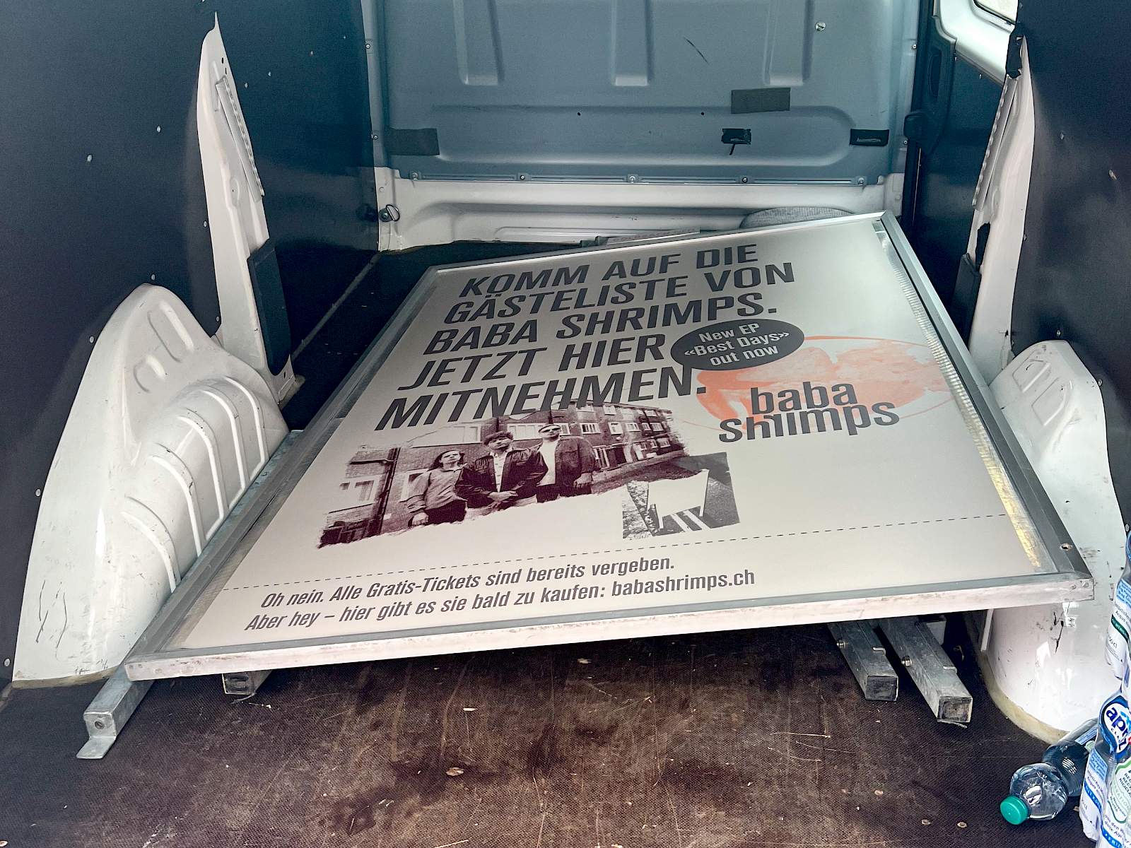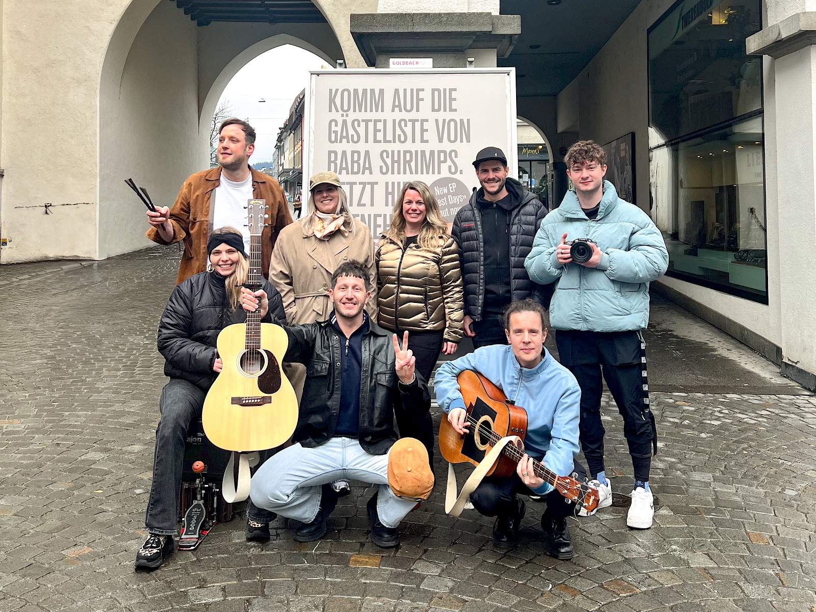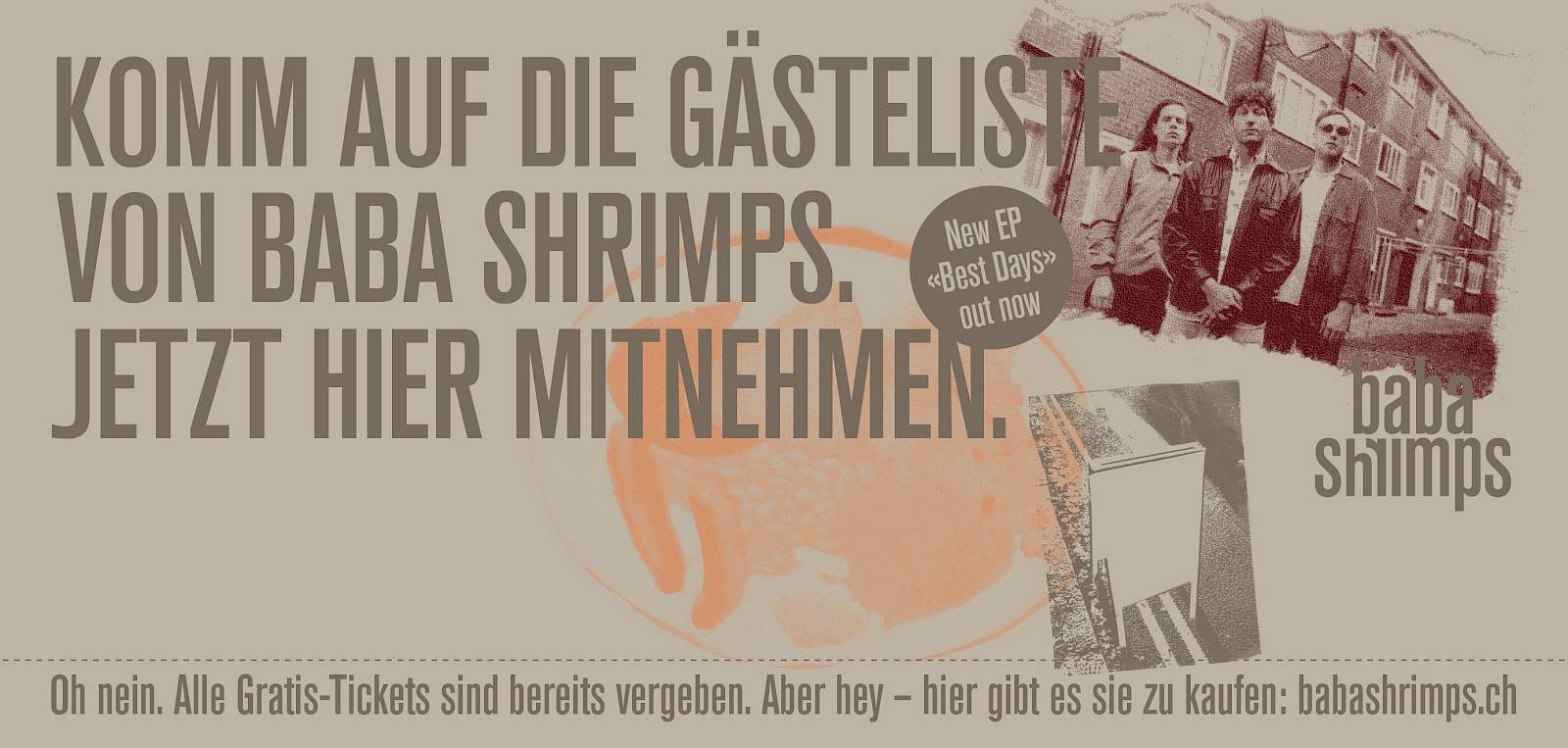 Das Zufallspublikum in den Schweizer Innenstädten kann sich kurzerhand einen Coupon für zwei exklusive Gästelisteplätze direkt am Plakat abreissen. Apropos Abriss: Die beworbene Plattentaufe im Zürcher Kaufleuten einige Wochen später ist ausverkauft, die Menge tobt. Übrigens: Beim Guerilla-Konzert auf dem Bundesplatz stehen plötzlich drei Bundesräte klatschend vor der Band. Die Passanten zücken das Handy, das Video geht viral und Baba Shrimps ist tagsdarauf im Blick.